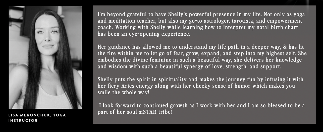 Working with Shelly while learning how to interpret my natal birth chart has been an eye opening experience. Her guidance has allowed me to understand my life path in a deeper way, and has lit the fire within me to let go of fear, grow, expand, and step into my highest self.