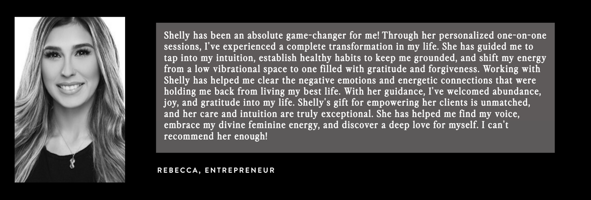 Shelly has truly changed my life! Through her personalized one-on-one sessions, I've experienced a complete transformation in my life. She has guided me to tap into my intuition, establish healthy habits to keep me grounded, and shift my energy for the better.